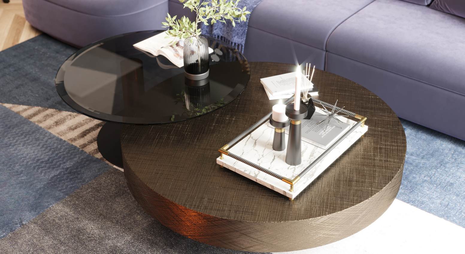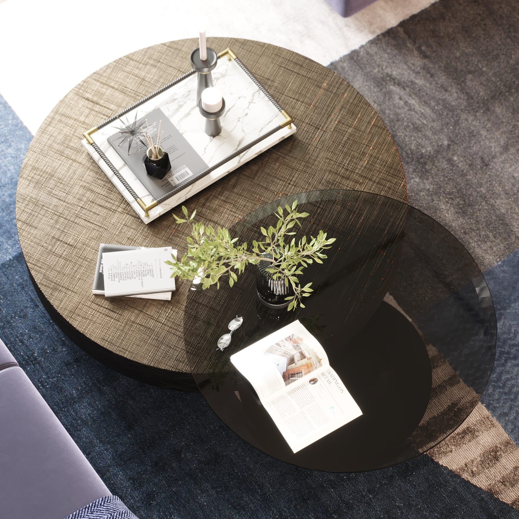Составной журнальный столик, из двух столов. Столешница из высокого тонированного стекла. Основание столешницы низкого столика из металла.